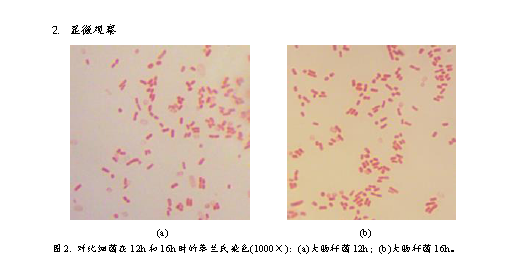 2、 將實驗菌株細菌在NA斜面置于37℃培養(yǎng),斜面生長至12h時,取菌進行革蘭氏染色,油鏡鏡檢。斜面繼續(xù)培養(yǎng)至16h時,同樣,取菌鏡檢。
