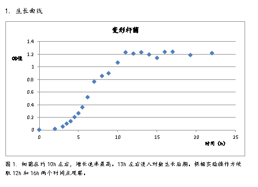 1、 普通變形桿菌菌種在5ml NA液體培養基中活化,活化的菌種接種于100ml NA液體培養基中,37℃搖床中培養,接種后立即取0.1ml測量OD值,后連續22h取菌液測其OD值,并繪制實驗菌株的生長曲線。