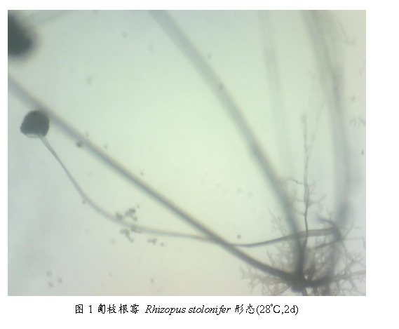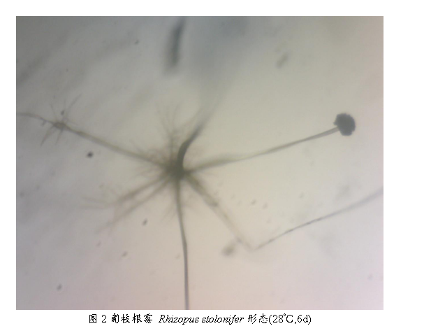 形態(tài)觀察特點: 在PDA培養(yǎng)基上接種,28℃培養(yǎng)。第2天即可看到匍枝根霉產(chǎn)孢,且產(chǎn)孢較多,易觀察。其菌絲無隔膜、有分枝和假根,營養(yǎng)菌絲體上產(chǎn)生匍匐枝,匍匐枝的節(jié)間形成特有的假根,從假根處向上叢生直立、不分枝的孢囊梗,頂端膨大形成圓形的孢子囊,囊內(nèi)產(chǎn)生孢囊孢子。培養(yǎng)一周左右可看到明顯的孢子脫落。連續(xù)觀察2周,仍然可以看到明顯的產(chǎn)孢結構,菌絲、孢子囊、假根形態(tài)觀察明顯。
