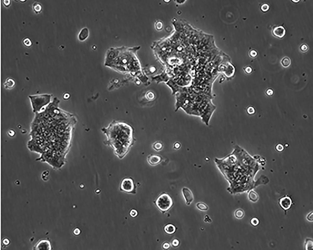 LS 174T is a variant of LS 180 that has been maintained by using trypsin in the subculture protocol. It is more easily subcultivated than that parent line and, like LS 180, it is reported to produce large amounts of carcinoembryonic antigen(CEA). Electron microscopic studies revealed abundant microvilli and intracytoplasmic mucin vacuoles. They are negative for p53 antigen expression, but positive for mRNA expression. LS 174T cells stain positively for cytokeratins. The line is positive for expression of c-myc, N-myc, H-ras, N-ras, Myb, and fos oncogenes. K-ras and sis oncogene expression were not detected. |